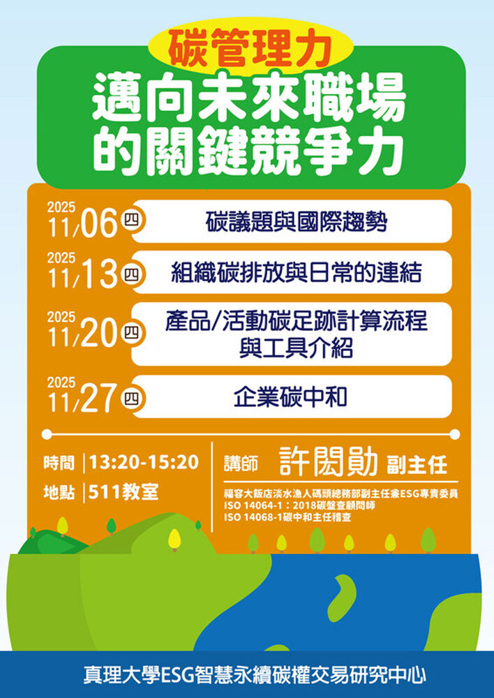 本系列講座邀請專家舉辦系列專題,以「碳議題與國際趨勢、碳盤查、碳足跡、碳中和」為核心主題,引導與會者認識碳管理知識並轉化為實際應用。除了提升與會者對永續發展的理解,更培養其跨領域思考、問題解決能力...