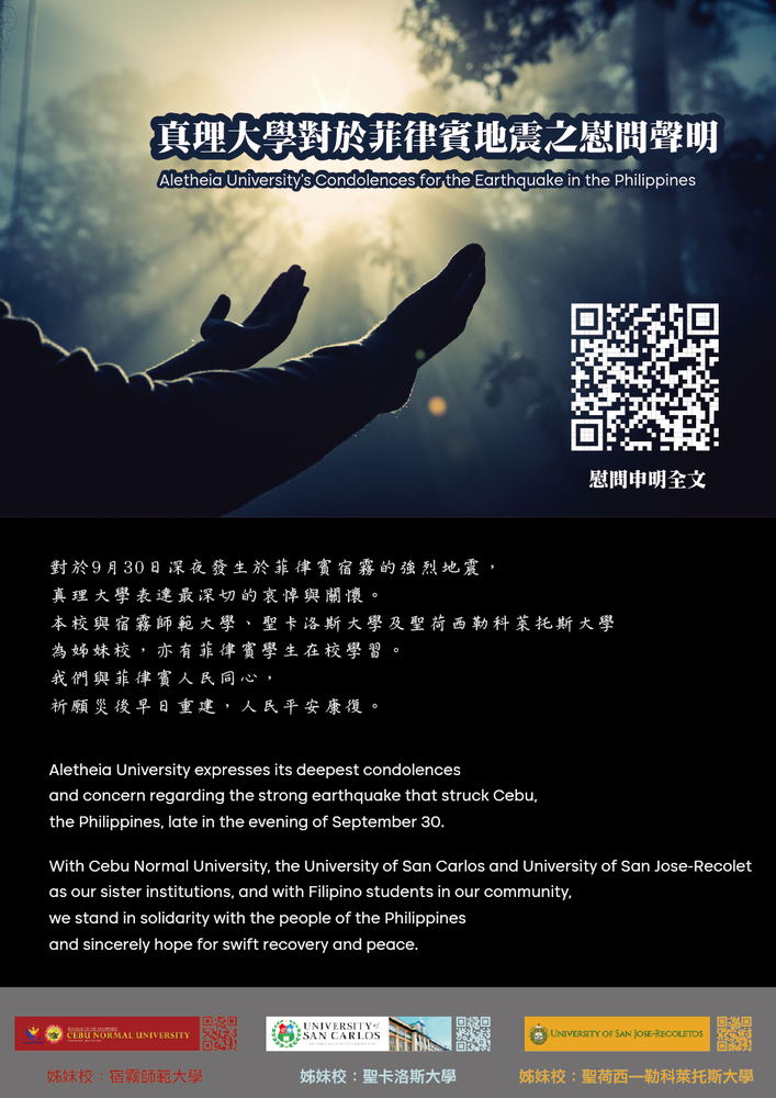 對於9月30日深夜發生於菲律賓宿霧的強烈地震,真理大學表達最深切的哀悼與關懷。 本校與宿霧師範大學及聖卡洛斯大學為姊妹校,亦有菲律賓學生在校學習。我們與菲律賓人民同心,祈願災後早日重建,人民平安康復。