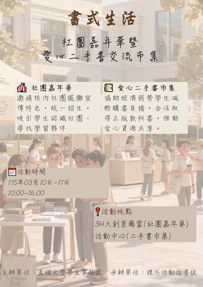 為了營造充滿書香與活力的校園氛圍,真理大學學生事務處特別舉辦 「書式生活:社團嘉年華暨愛心二手書交流市集」。